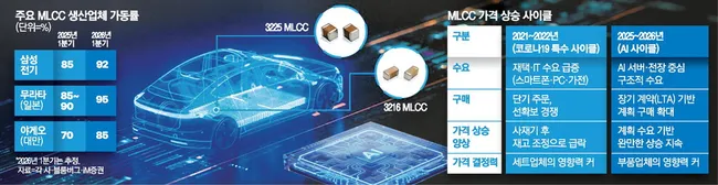 일본의 다이요유덴과 무라타 등 글로벌 상위 업체들이 먼저 가격 인상 신호를 보냈고, 글로벌 2위 기업인 삼성전기도 가격 인상 대열에 합류하려는 분위기다. 삼성전기와 무라타의 MLCC 가동률은 90%대를 유지하며 사실상 풀가동 상태에서도 재고가 쌓이지 않고 있다.