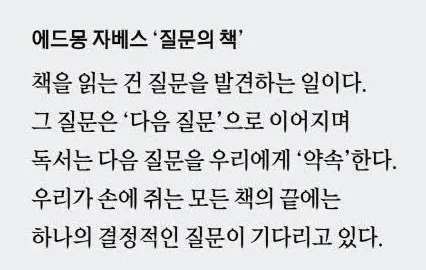 유대인 철학자 에드몽 자베스의 저작 '질문의 책'은 인물과 사건의 궤적을 따르는 고전적 서사 질서를 근원적으로 전복한다. 이 책에서는 무수한 문장들이 밤하늘의 별처럼 흩어져 빛나며, 각 문장이 하나의 완결된 사유를 이루는 아포리즘으로 기능한다.