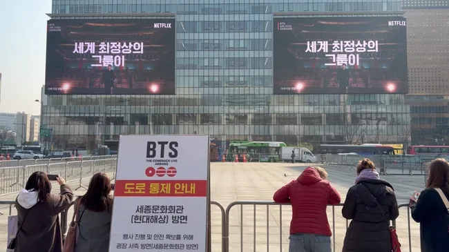 21일 광화문광장에서 열리는 BTS 컴백 콘서트를 앞두고 외국인 관광객들이 서울로 몰려들고 있다. 미국, 일본, 독일, 페루 등 세계 각지에서 온 팬들은 세종문화회관 앞에서 성지 인증을 하고 하이브 건물 등 BTS 관련 장소를 방문하며 '성지순례'를 즐기고 있다.
