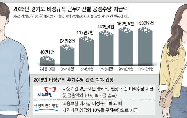정규직과 기간제 노동자의 시간당 임금 격차가 8115원으로, 계약직 임금이 정규직의 70% 수준에 머물러 있다. 이재명 대통령은 지난 9일 국민경제자문회의에서 고용이 불안정한 비정규직이 더 많은 보수를 받아야 한다고 언급했으며, 노동부는 기간제법 개편 논의에서 1년 미만 계약직에 '공정수당' 도입을 검토하고 있다.