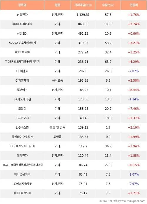 기관 순매수 상위 20개 종목 중 전기·전자 업종이 5개를 차지했다. 삼성SDI, 엘앤에프 등 2차전지 관련주와 반도체 레버리지 ETF도 동반 매수됐다.