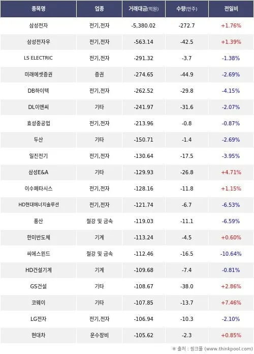 외국인 투자자가 거래소에서 전기·전자 업종 종목을 집중 매도했다. 3일에는 HD현대중공업·삼성SDI·에코프로머티 등이, 7일에는 삼성전자·삼성전자우·LS ELECTRIC 등이 순매도 상위에 올랐다.