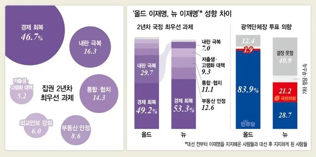 다만 '올드 이재명'(대선 전부터 지지층)과 '뉴 이재명'은 정당 선호도와 지방선거 투표 의향에서 뚜렷한 차이를 보였다. '올드 이재명'은 민주당 지지 85.5%, 지방선거 민주당 투표 의향 83.9%인 반면, '뉴 이재명'은 민주당 34.1%, 국민의힘 24.8%로 갈려 있으며 지방선거 투표 의향도 불확실한 상태다.