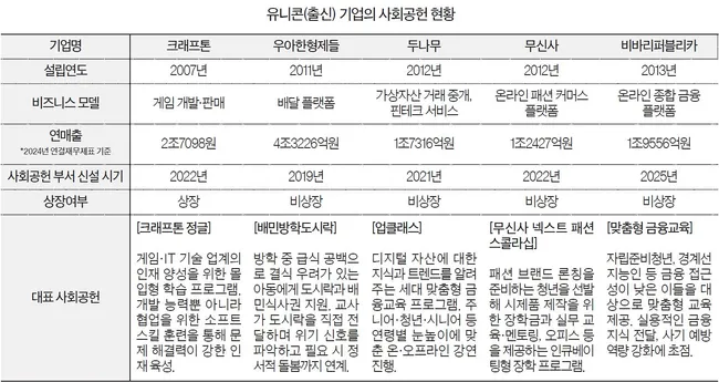 유니콘의 사회공헌은 자신의 비즈니스와 연결된 영역에 집중된다. 토스는 금융 접근성 강화, 무신사는 청년 패션 창업가 양성, 크래프톤은 개발자 인재 양성 등 기업이 해결하던 사회문제를 사회공헌으로 확장하고 있다. 창업자의 문제의식이 사회공헌 방향을 결정하는 것도 특징이다.