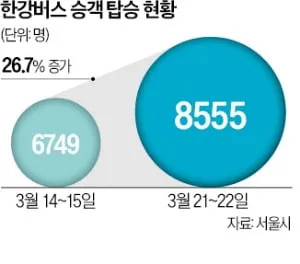 방탄소년단의 21일 광화문 복귀 공연을 계기로 서울 한강버스 이용객이 크게 늘었다. 지난 주말(21~22일) 탑승객은 8555명으로 직전 주 대비 1806명(26.7%) 증가했으며, 공연 당일 좌석 점유율은 56.54%를 기록했다.