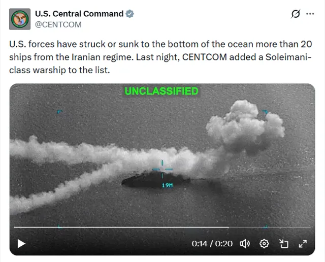 미국이 이란에 대한 군사작전 5일째인 4일 이란 군함 20척 이상을 격침했다고 밝혔다. 미 중부사령부(CENTCOM)는 이란의 솔레이마니급 전함을 포함해 선박 20척 이상을 공격하거나 침몰시켰으며, 2,000개 이상의 목표물을 공격했다고 발표했다.