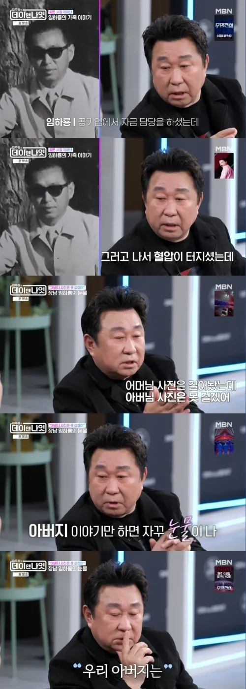 코미디언 임하룡이 28일 방송된 MBN '김주하의 데이앤나잇'에 출연해 자신의 인생을 회고하며 아버지에 대한 그리움으로 눈물을 흘렸다.