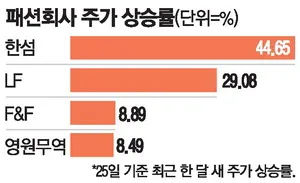 주식시장 상승으로 투자자들의 자산가치가 증대되면서 의류 쇼핑 수요가 확대되고 있다. 한섬은 한 달 새 44.65% 급등했으며, LF(29.08%), 영원무역(8.49%), F&F(8.89%) 등 패션기업들도 동반 강세를 보이고 있다.