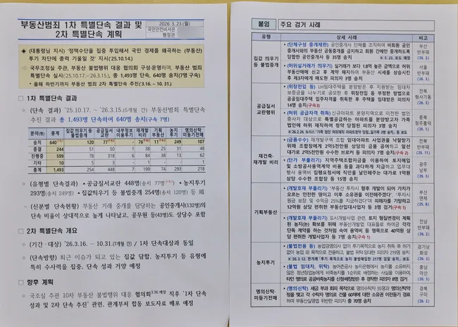 정부는 26일 자세한 성과를 발표하고 10월 31일까지 2차 특별단속을 실시할 예정이다. "망국적 부동산 공화국 정상화 없이 대한민국의 미래는 없다"는 대통령의 발언은 부동산 범죄 척결에 대한 강한 의지를 드러냈다.