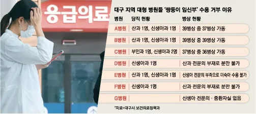지난 3월 대구에서 쌍둥이 임신부가 7개 병원의 수용 거부 끝에 태아 1명이 사망한 사건이 알려진 뒤 전국적 파장이 커지고 있다. 수용 거절 사유는 병상 부족과 산과·신생아과 전문의 부족이었으며, 2024년 12월 재이송 사례 397건 중 58건은 병상 부족, 152건은 전문의 부재 때문이었다.