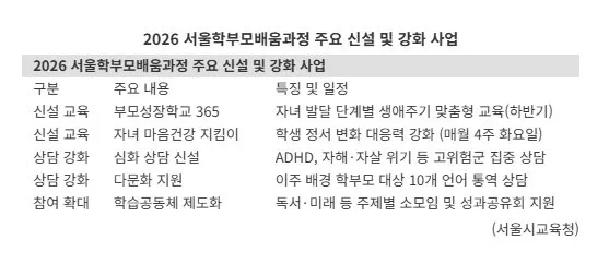 서울시교육청이 '부모성장학교 365'와 '자녀 마음건강 지킴이 교육' 등을 포함한 '2026 서울학부모배움과정'을 17일부터 본격 운영한다. 기본·전문·특별교육의 세 분야로 나눠 11월까지 진행되며, 지난해 참여 학부모 3만914명의 95% 만족도를 바탕으로 교육과 상담, 정책 참여를 통합 지원한다.