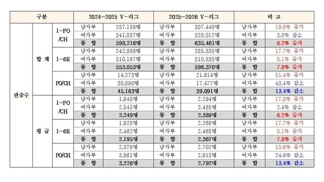 2025∼2026 V리그 시즌이 남녀부 정규리그와 포스트시즌 총관중 63만5461명을 기록하며 역대 최고 흥행을 달성했다.