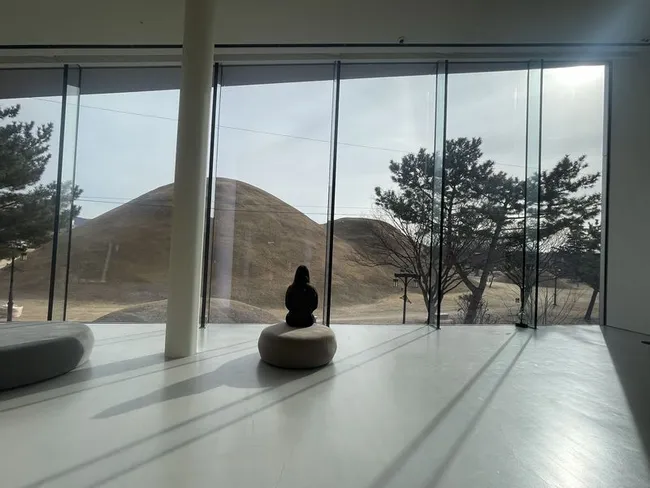 홍익대 유현준 교수가 설계한 이 미술관은 리브 글라스 공법으로 창틀을 최소화한 파노라마 뷰, 종이접기처럼 꺾은 박공 지붕으로 역동적인 천장 높이 변화, 반사유리를 통한 경계 흐림 등으로 방문객과 미술, 고분 사이의 관계를 조율하는 건축 장치로 작동한다.