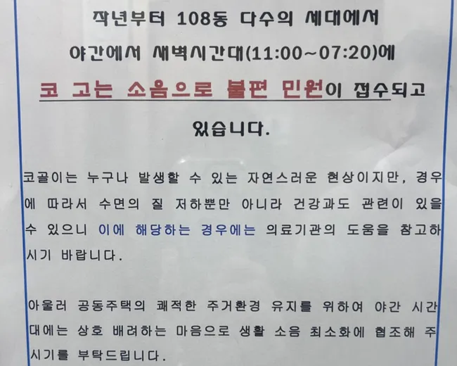 서울의 한 아파트에서 입주민 대표회의가 코골이 소음을 주제로 한 공문을 엘리베이터와 게시판에 붙여 온라인에서 화제가 됐다. 공문에는 108동에서 야간부터 새벽시간대에 코 고는 소음 민원이 접수되고 있으며 의료기관의 도움을 참고해달라는 내용이 담겼다.