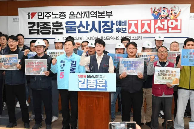 민주노총 울산지역본부는 13일 6.3 지방선거 울산시장 선거에 출마한 진보당 김종훈 후보를 지지한다고 선언했다. 울산지역본부는 노동중심의 경제 선순환과 사람 중심의 산업전환이 필요하다며, 현장에서 검증된 '진심과 실력의 시장' 김종훈을 지지한다고 밝혔다.