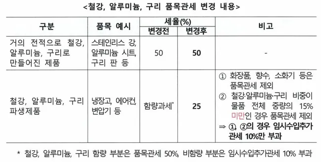기존에는 함량 부분에 50%, 비함량 부분에 10% 임시수입추가관세를 각각 부과했으나 이제는 전체 가격에 일괄 적용된다. 냉장고·에어컨·변압기 등은 25% 관세가 부과되고, 화장품·향수·소화기 등은 제외된다. 물품에 포함된 철강·알루미늄·구리 총 중량이 전체 중량의 15% 이하인 경우는 관세가 부과되지 않는다.