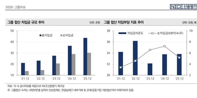 나이스신용평가는 17일 보고서에서 공격적인 투자와 운전자금 부담으로 잉여현금흐름이 제한적이며, 최근 3년간 매년 5조원을 웃도는 현금 부족이 발생했다고 분석했다. 부족 자금은 차입으로 메워져 총차입금이 44조원, 순차입금이 30조원으로 증가했다.