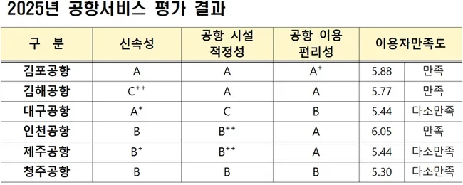 항공사 평가에서는 국적사가 평균 우수(B+) 등급을 기록했으며, 외항사는 평균 우수(B) 수준을 나타냈다. 공항 평가에서는 김포공항이 이용 편리성에서 A+로 최고 평가를 받았고, 김해공항은 혼잡도 관리 미흡으로 C++ 등급에 그쳤다.
